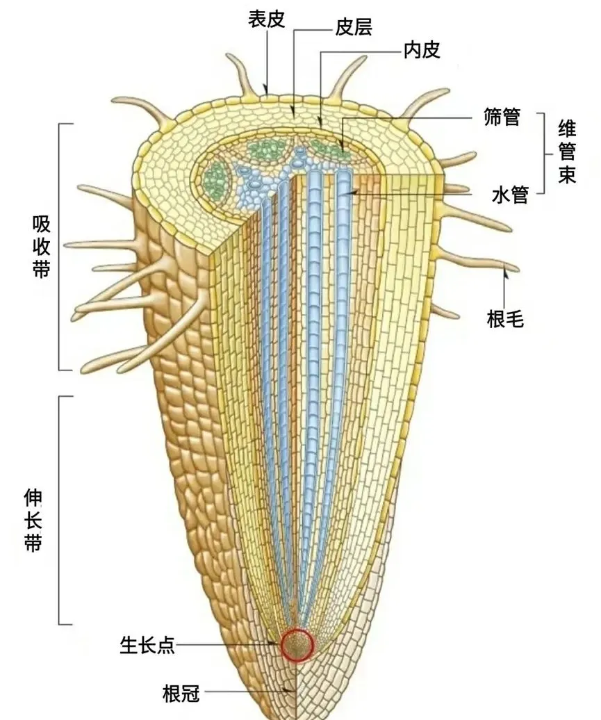 根分为根尖结构、初生结构和次生结构三部分。根尖是主根或侧根尖端,是根的最幼嫩、生命活动最旺盛的部分,也是根的生长、延长及吸收水分的主要部分。根尖分成根冠、分生区、伸长区和成熟区。根生长最快的部位是伸长区。伸长区的细胞来自分生区。