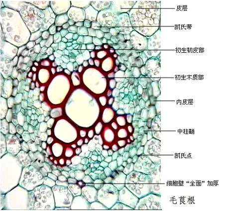 由根尖顶端分生组织经过细胞分裂、生长和分化形成了根的成熟结构,这种生长过程为初生生长。在初生生长过程中形成的各种成熟组织属初生组织,由它们构成根的结构,就是根的初生结构。若从根尖成熟区作一横切面可观察到根的全部初生结构,从外至内分为表皮、皮层和维管柱三部分。